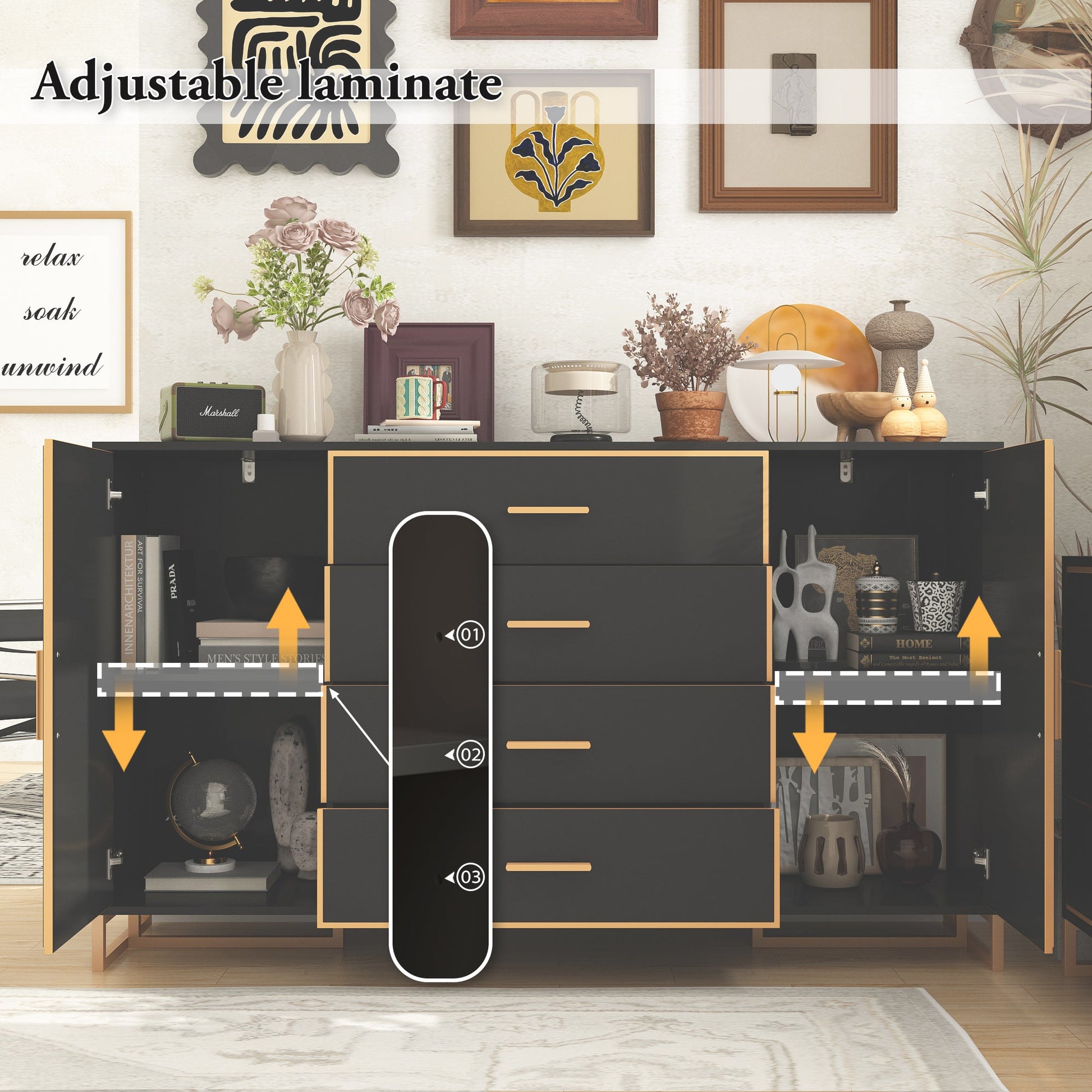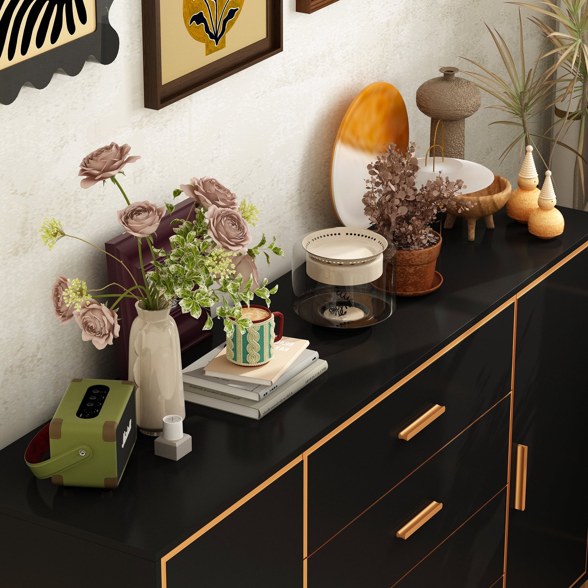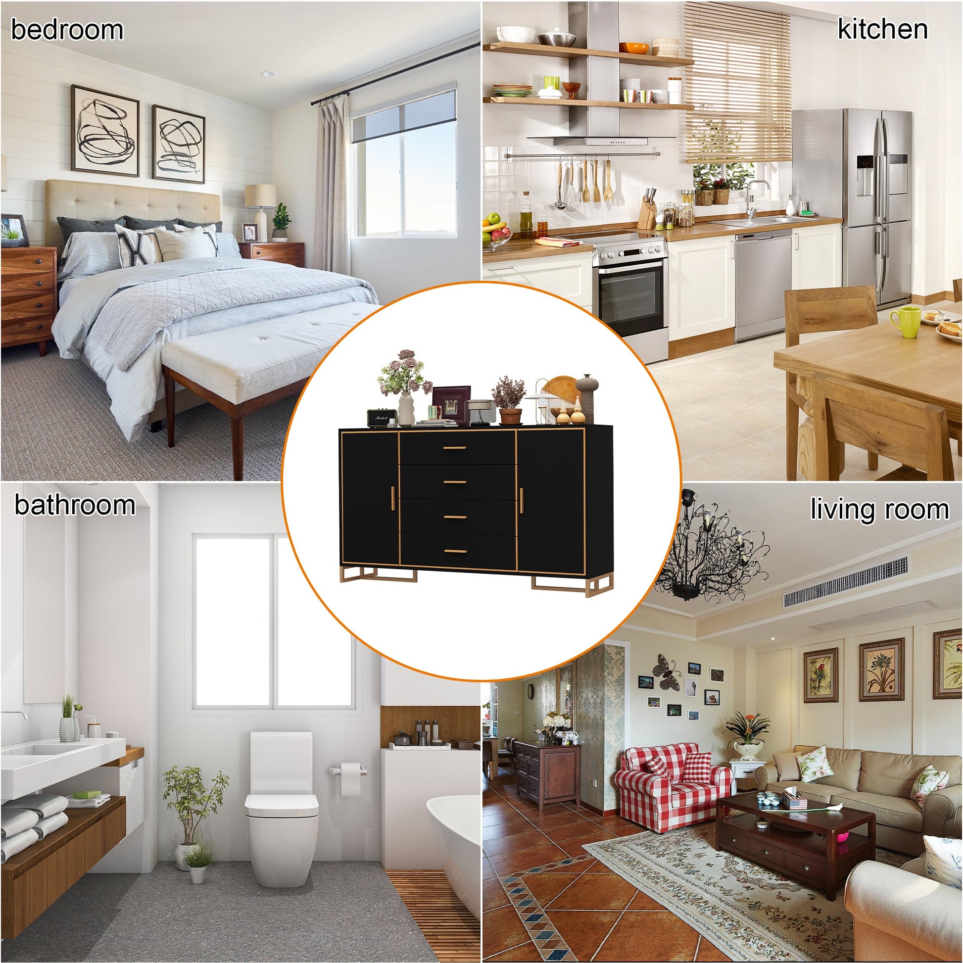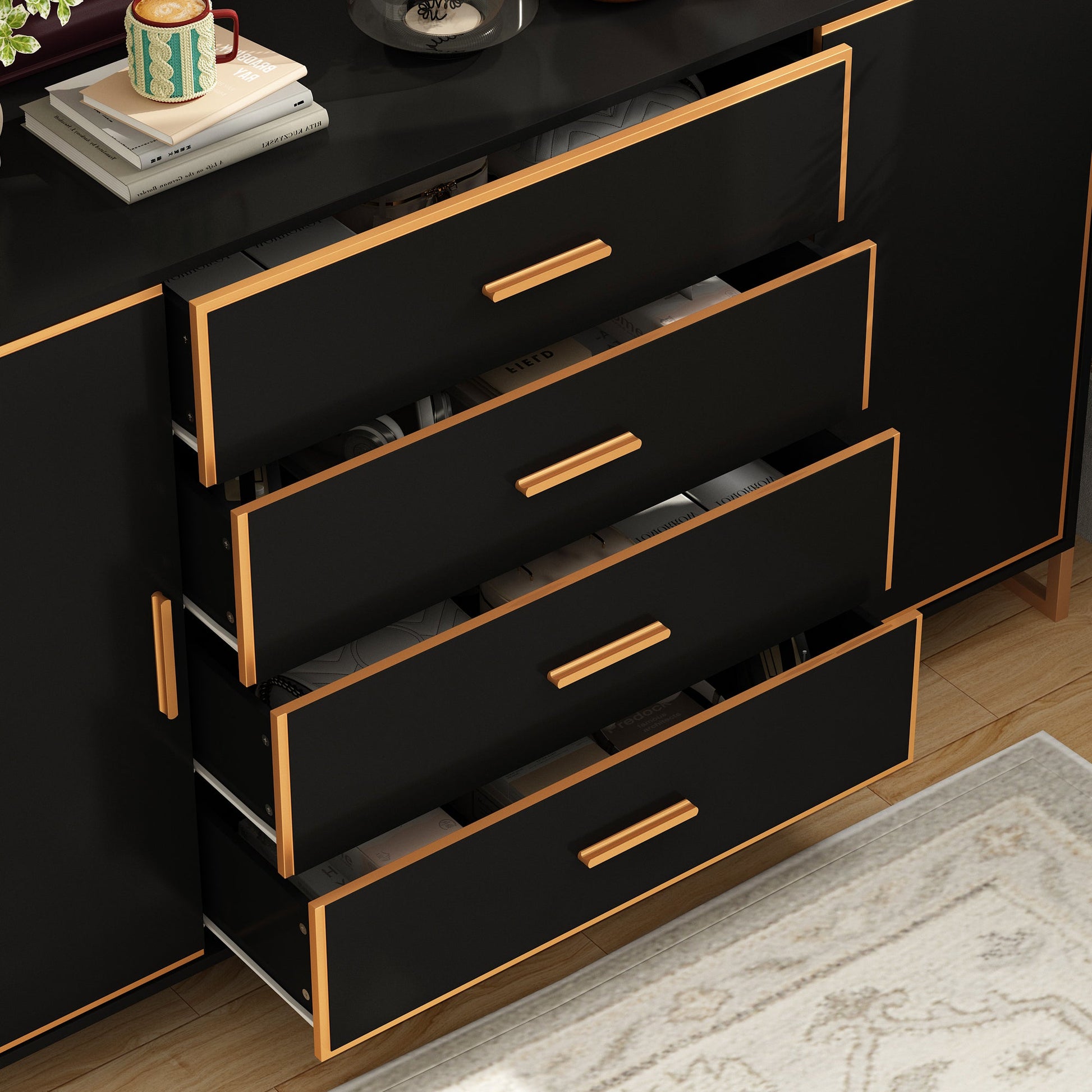 Cette commode à quatre tiroirs et deux portes est idéale pour la chambre. Ses quatre grands tiroirs offrent un espace de rangement optimal pour vos bijoux, lunettes de soleil, sous-vêtements, produits de soin, appareils électroniques et bien plus encore. Son espace de rangement ultra-résistant vous permettra de garder votre chambre propre et rangée en permanence. La finition noire de ce meuble de rangement, rehaussée de détails dorés, lui confère une élégance et un style raffinés, s'harmonisant avec tous les styles de décoration.