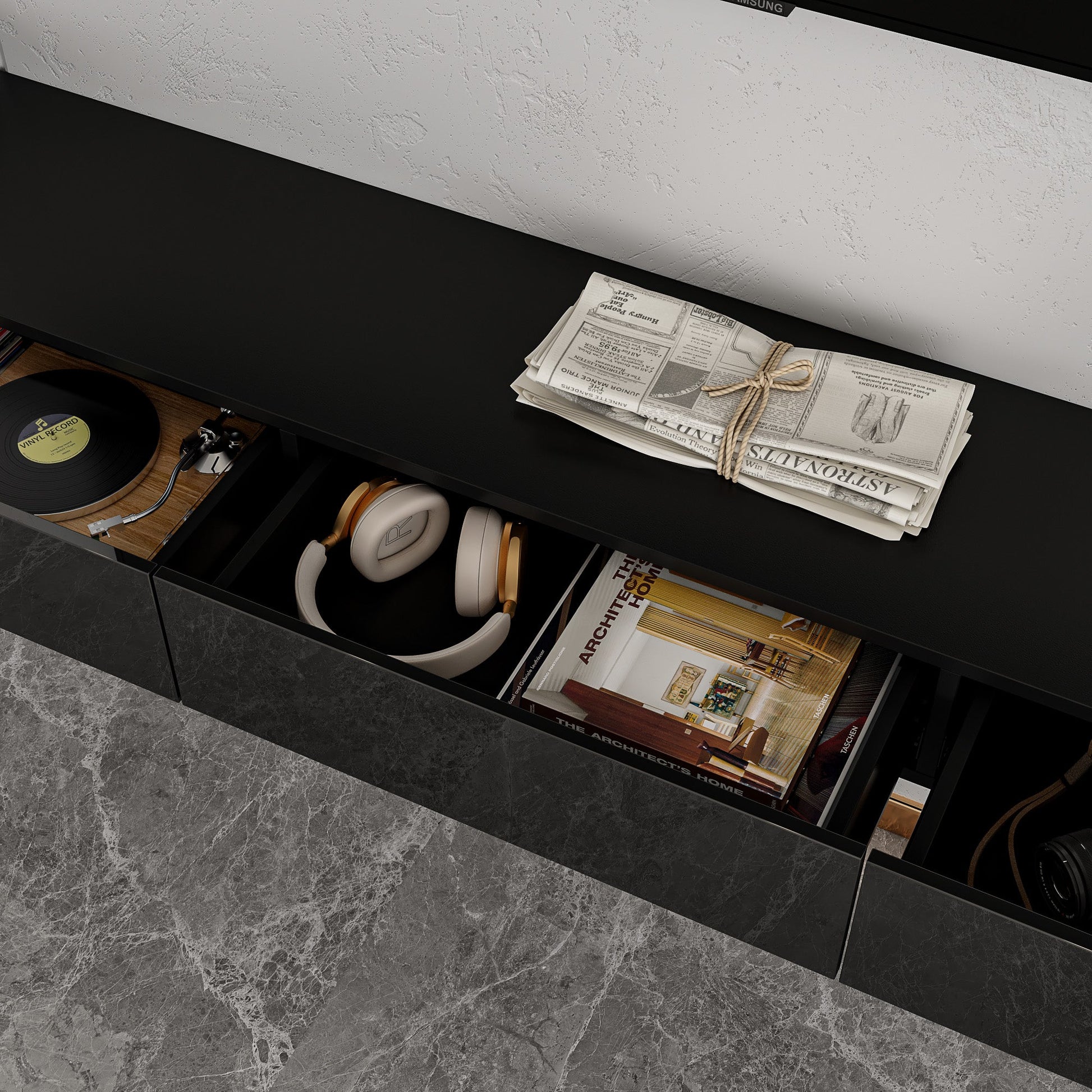 Apportez une touche de modernité à votre espace multimédia grâce à notre meuble TV laqué brillant et son éclairage LED éblouissant, créant ainsi une ambiance saisissante pour votre home cinéma. Ce meuble TV est non seulement idéal pour votre espace de divertissement, mais il allie aussi parfaitement design et fonctionnalité. Sa composition en deux parties vous permet de moduler l'installation selon vos envies. Que ce soit pour vous détendre devant un film ou organiser une soirée jeux en famille, ce meuble TV est le compagnon idéal. Son design sophistiqué, son grand espace de rangement et son éclairage LED exceptionnel offriront une expérience unique à vos moments de divertissement à domicile.