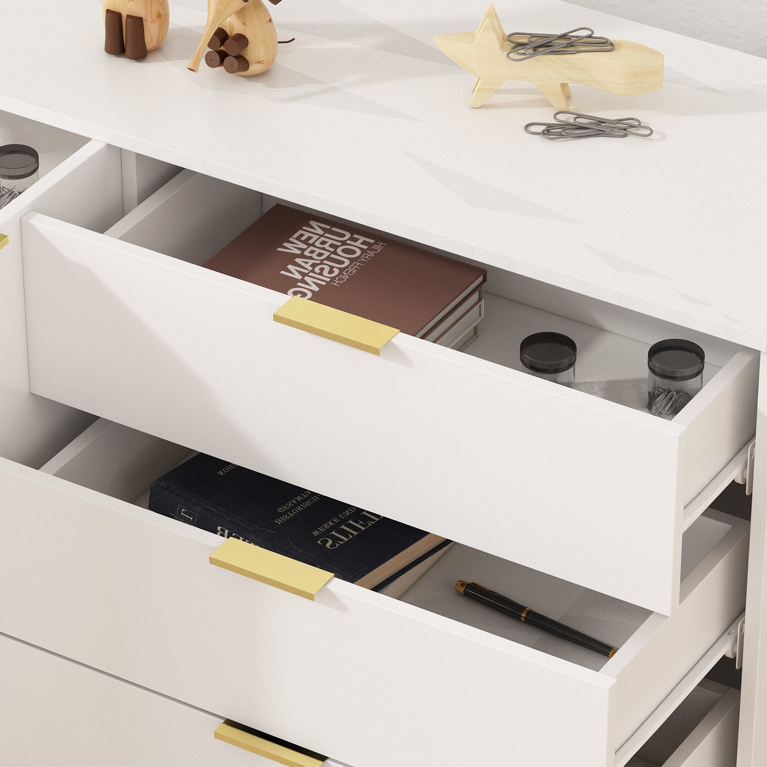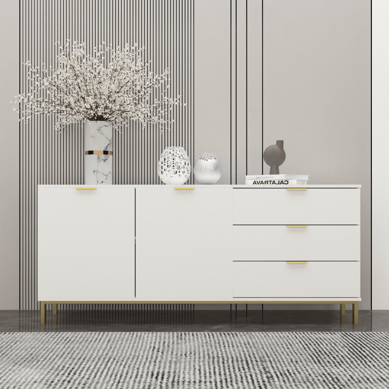 Apportez une touche d'élégance moderne à votre intérieur avec ce buffet aux lignes épurées. Ses pieds en métal lui confèrent une grande stabilité, rehaussée par d'élégantes poignées. Ce meuble se distingue par sa robustesse et sa durabilité. Il peut également servir de commode, accueillir votre téléviseur et ranger vos accessoires multimédias dans un espace de rangement dissimulé.