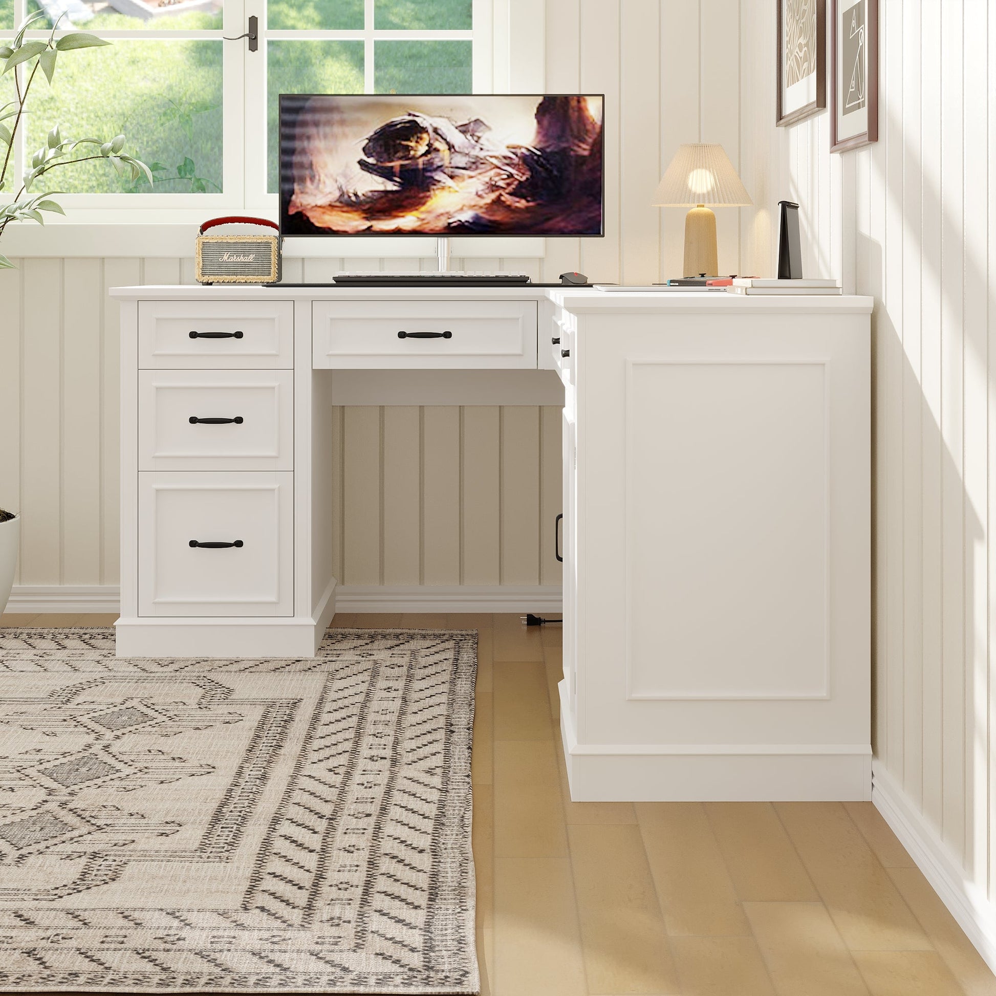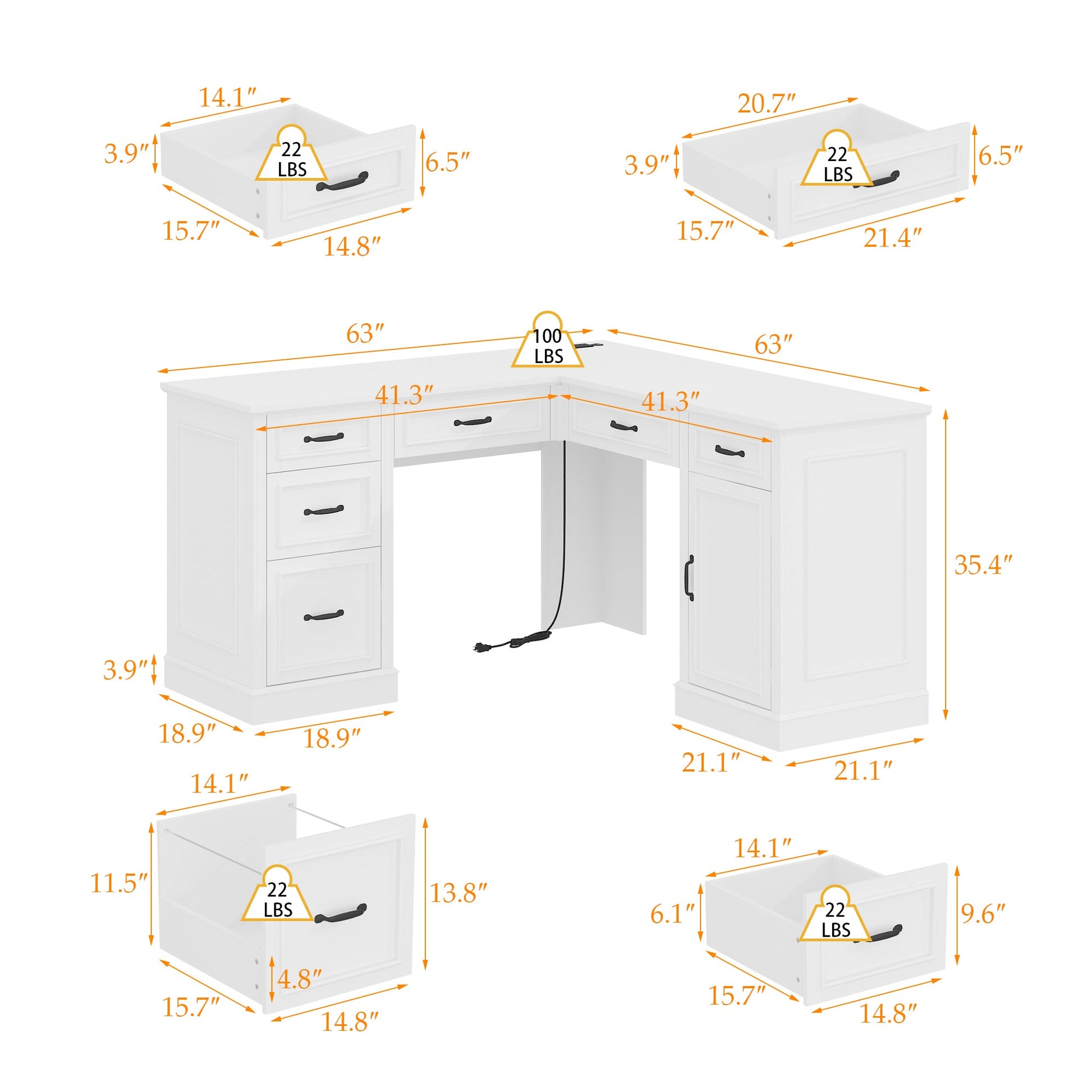 Optimisez votre espace de travail à domicile avec ce bureau d'angle en L de 160 x 160 cm, à la fois élégant et fonctionnel. Conçu pour les espaces de travail modernes, ce bureau entièrement blanc offre un style épuré et professionnel tout en optimisant son utilisation. Son plateau spacieux en forme de L offre un espace généreux pour votre écran, votre ordinateur portable, vos documents et vos objets de décoration. Le système de gestion des câbles intégré vous permet de désencombrer votre bureau, tandis que la prise électrique intégrée comprend deux prises secteur, un port USB et un port USB-C, garantissant ainsi que vos appareils soient toujours chargés et prêts à l'emploi. Sous le bureau, six tiroirs, dont un tiroir à dossiers suspendus avec deux barres de suspension, et un placard de rangement dissimulé offrent des solutions d'organisation polyvalentes pour tous vos accessoires de bureau. Avec ses poignées noires contrastantes qui lui confèrent une touche contemporaine, ce bureau est la pièce maîtresse idéale pour tout espace de travail productif.