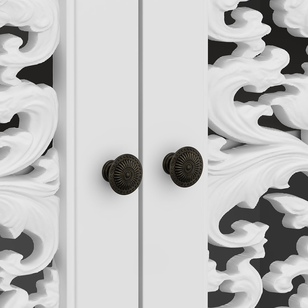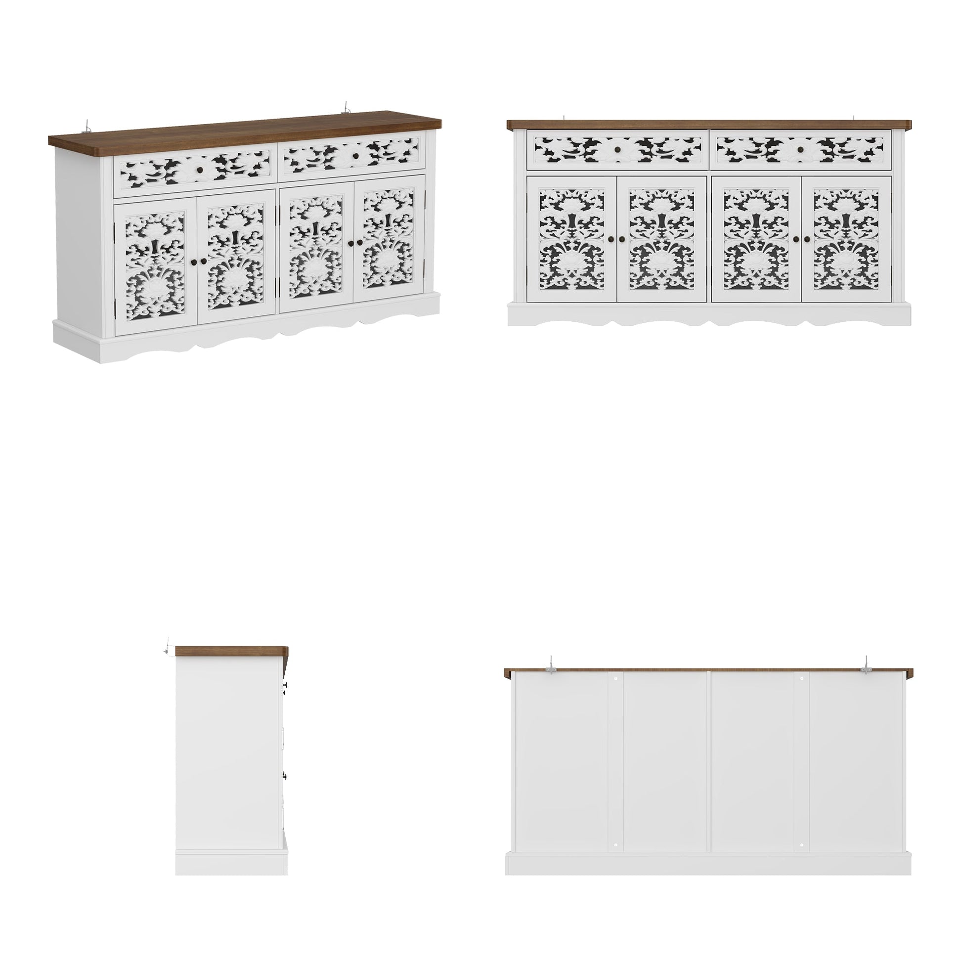 Ce buffet de 63 pouces présente un comptoir en noyer associé à des panneaux de porte blancs sculptés, affichant un style campagnard français élégant.