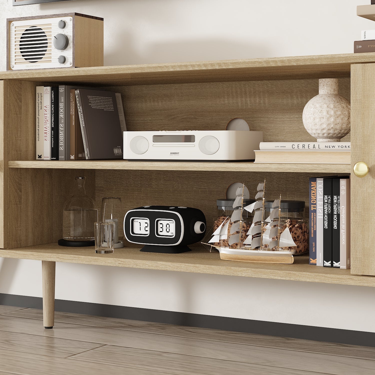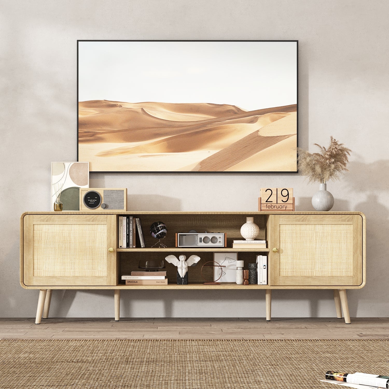 Meuble TV/console multimédia de 70,9 pouces de large avec 2 étagères ouvertes et portes en rotin