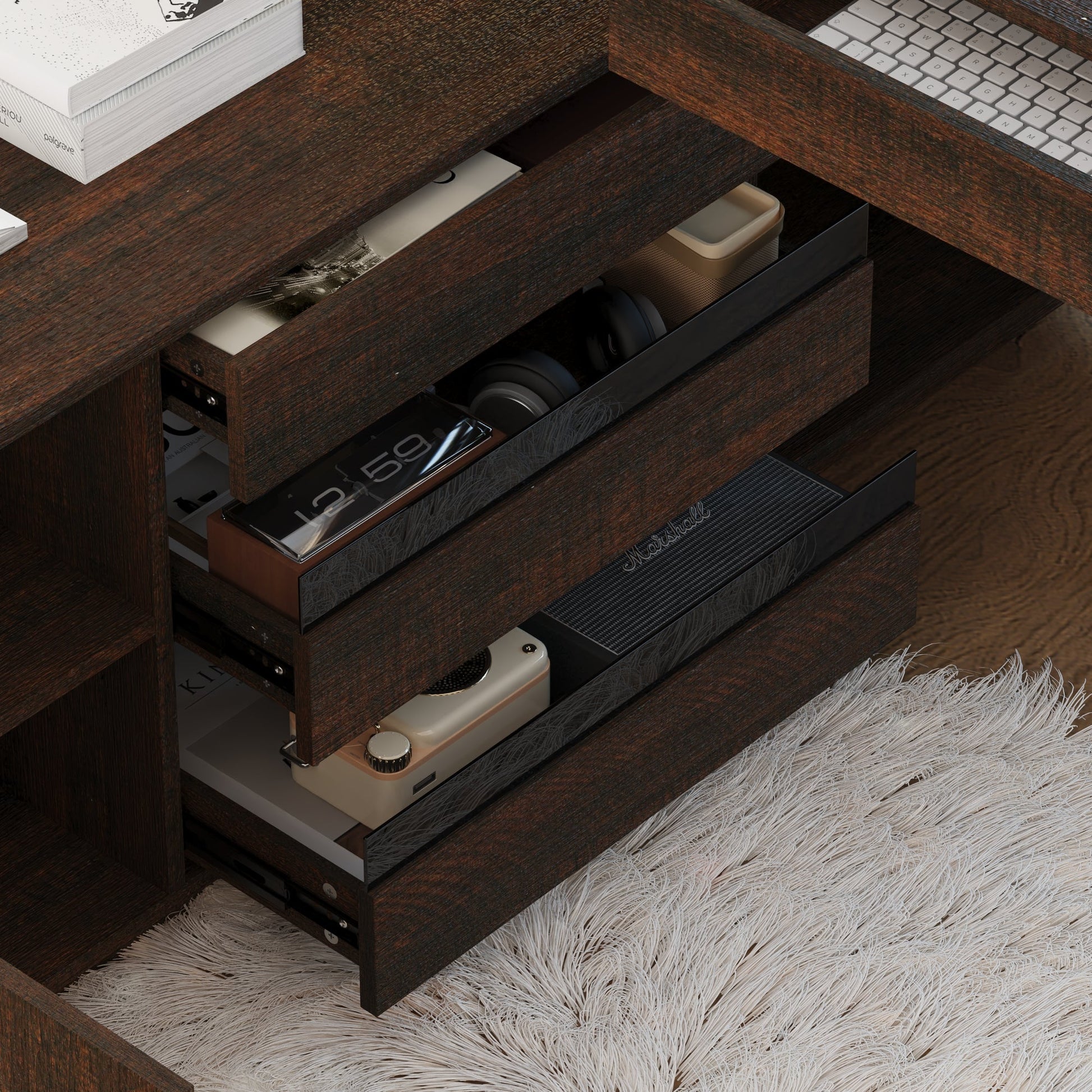 Bureau d'ordinateur en L à 3 tiroirs relevables (hauteur réglable de 74 à 112 cm) avec bibliothèque de 150 cm de large