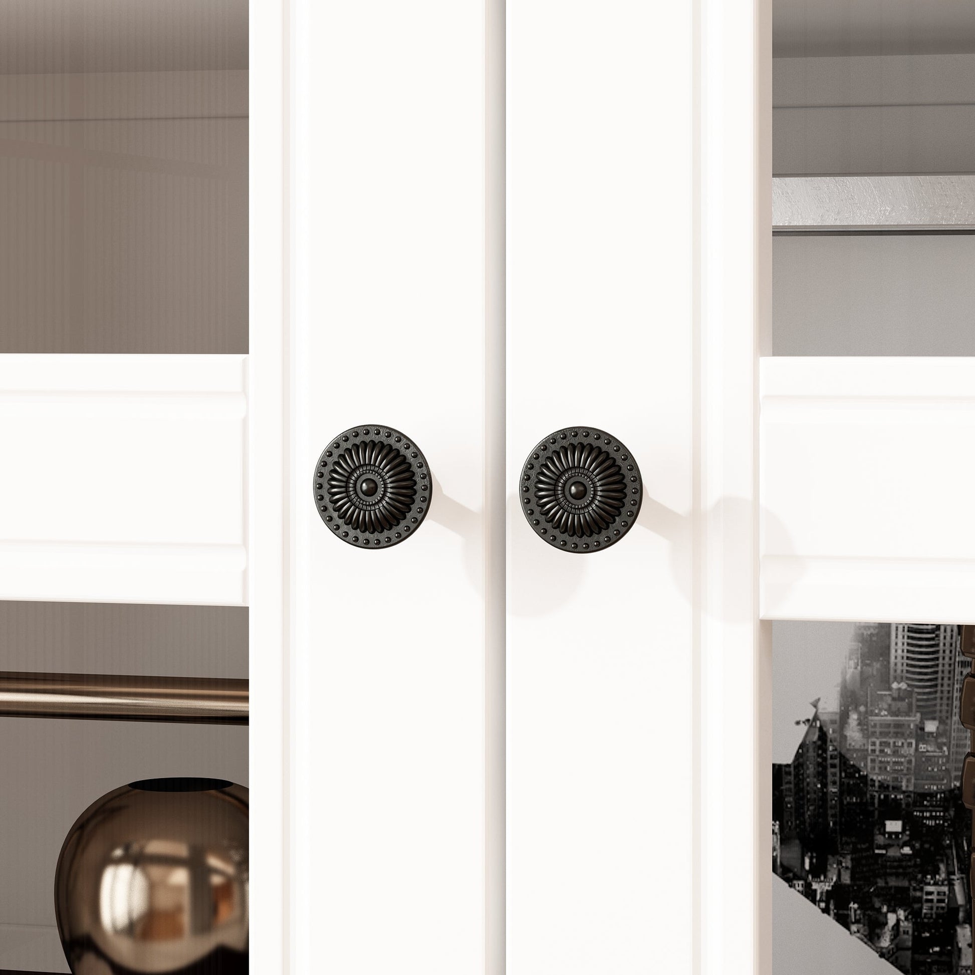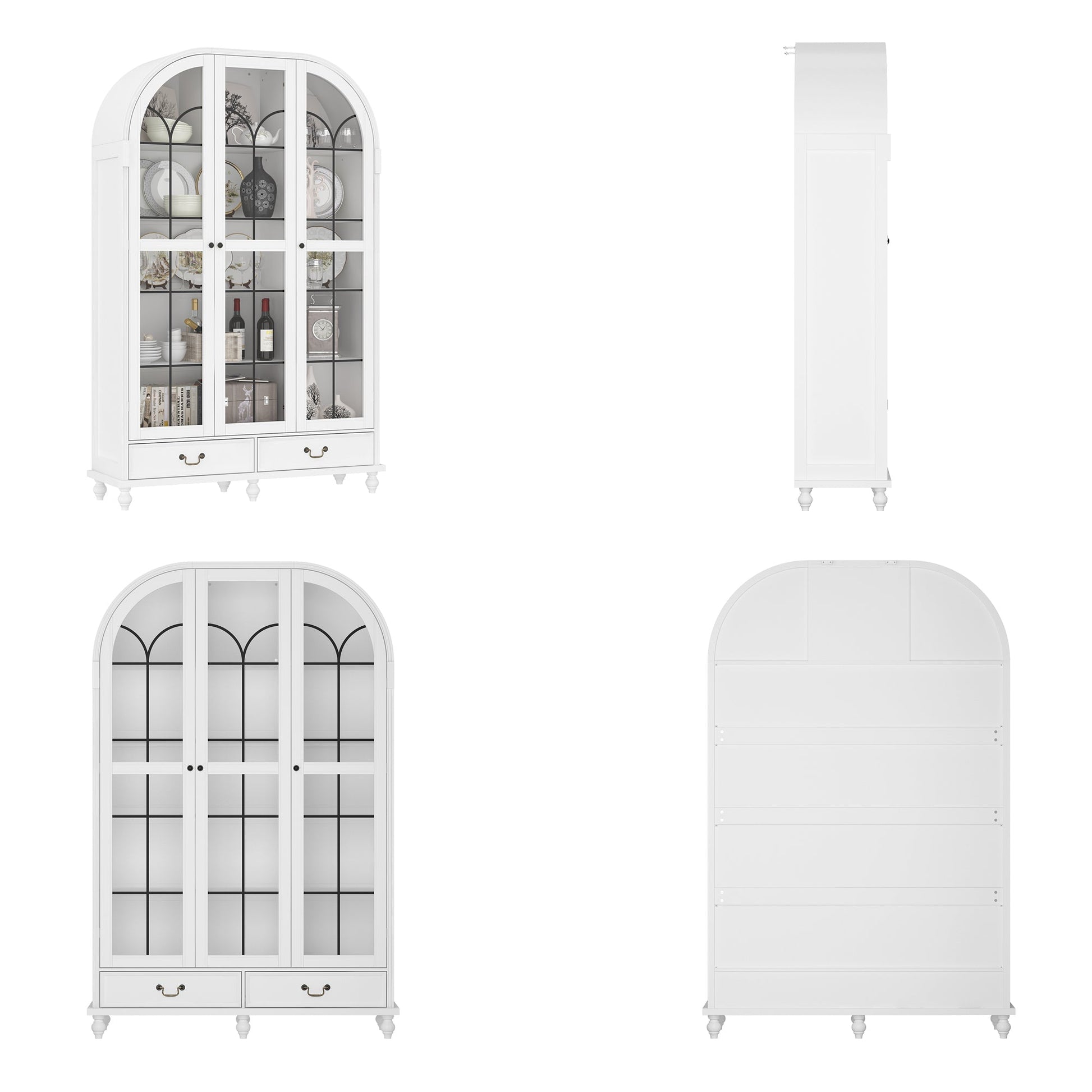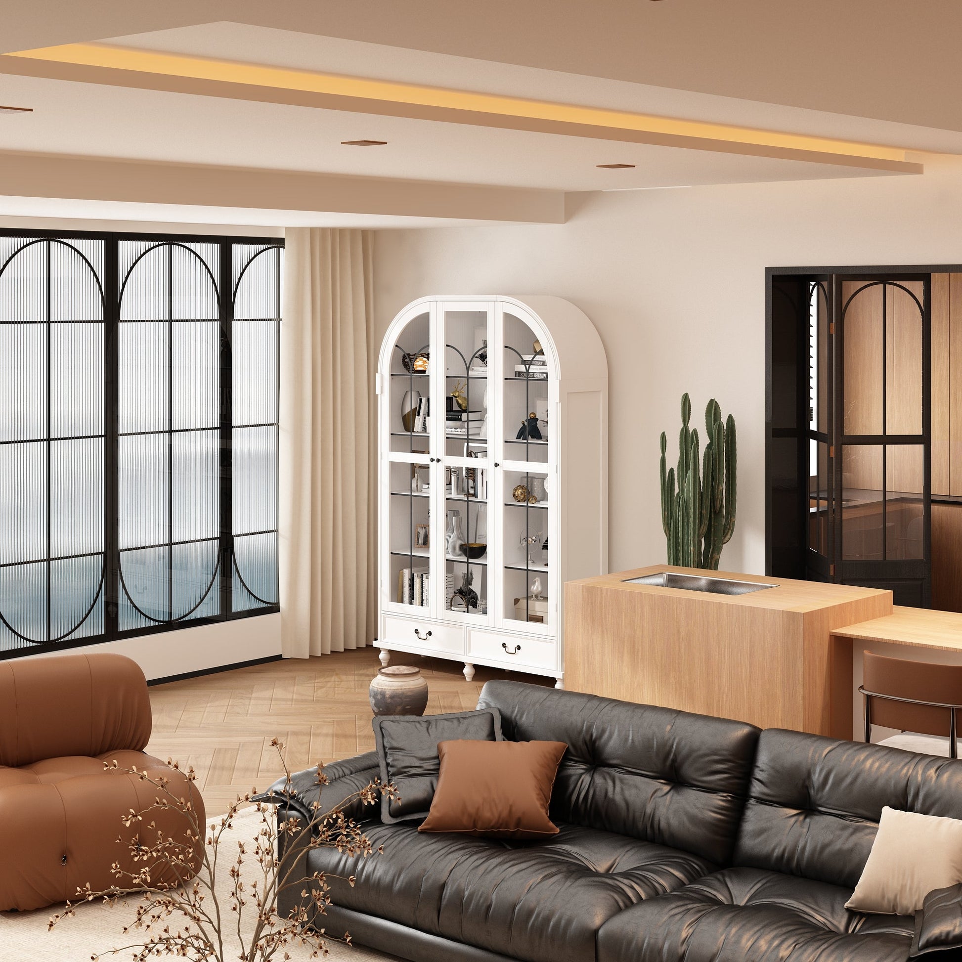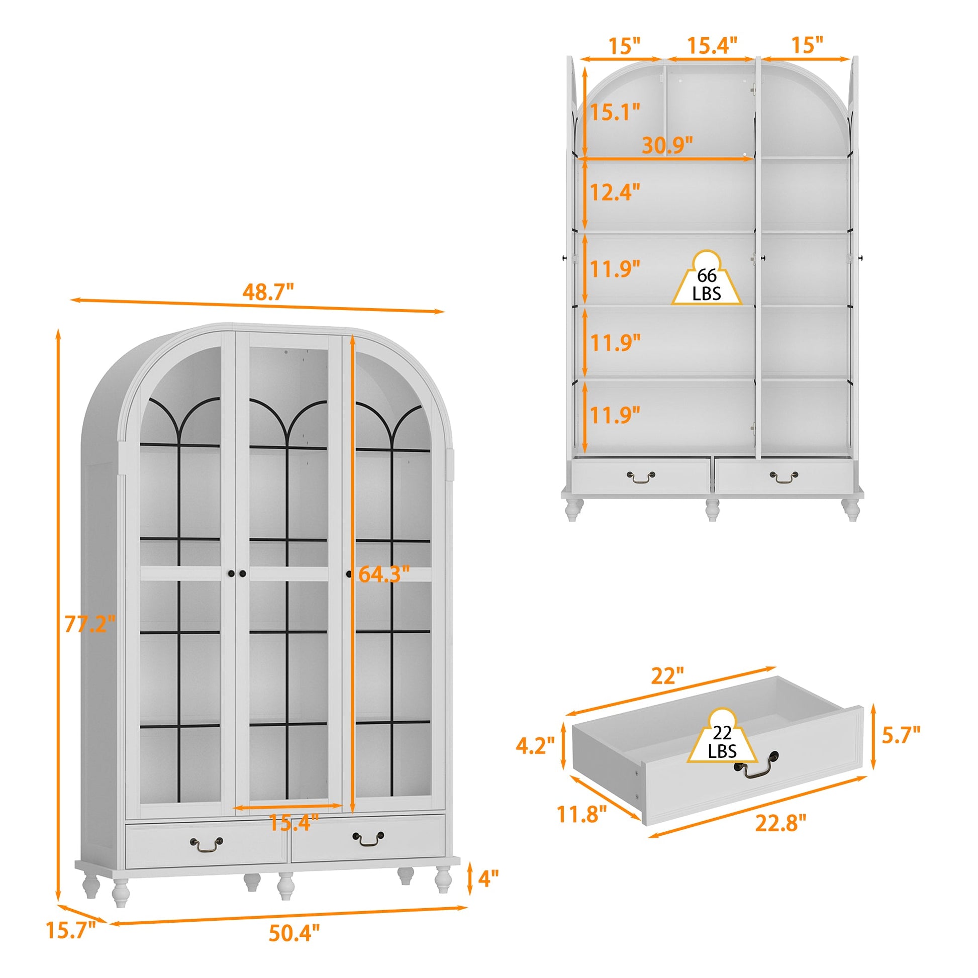 Bibliothèque blanche cintrée à 5 niveaux avec portes et tiroirs en verre, 77 po H x 50 po L