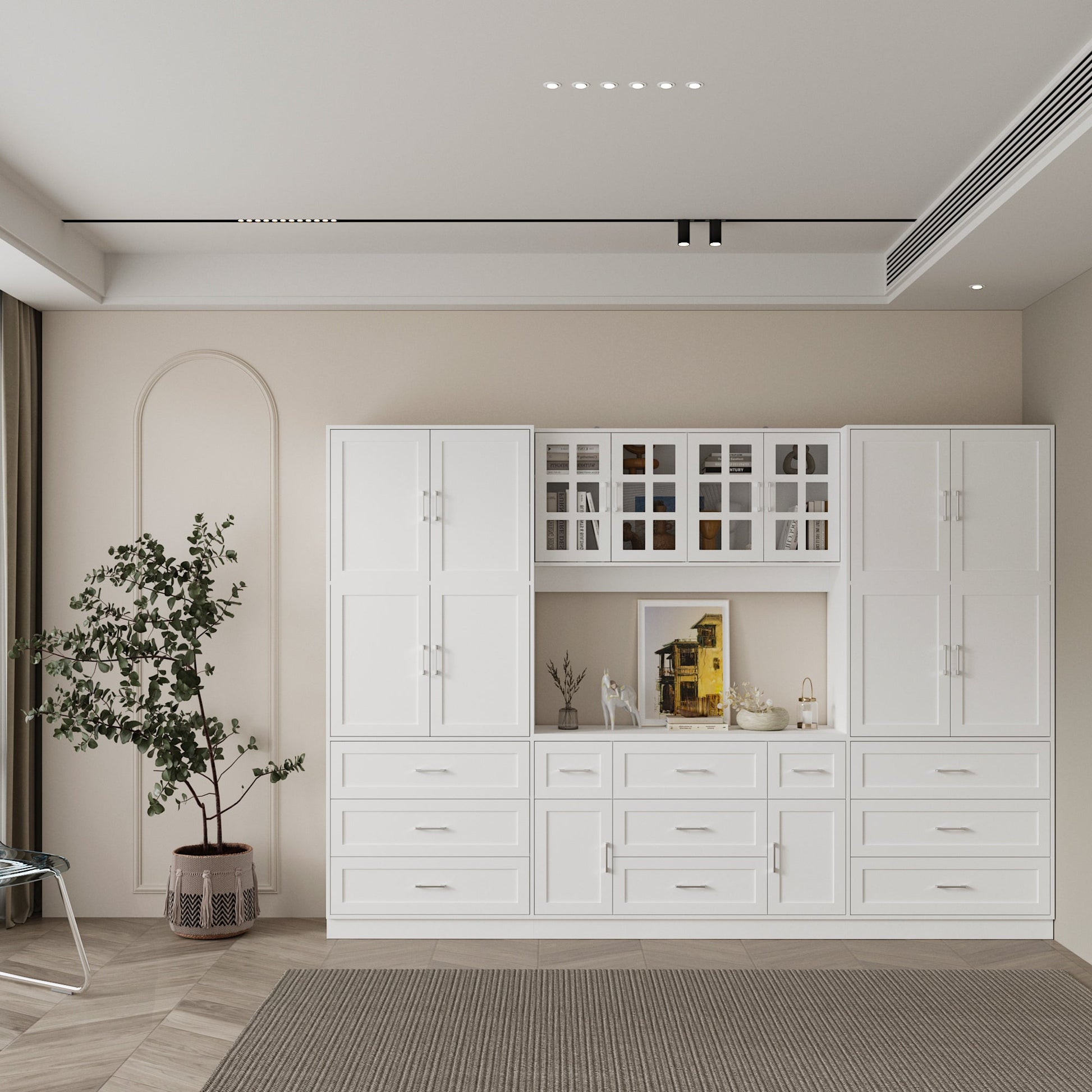 Sublimez votre intérieur avec cette grande bibliothèque blanche, à la fois élégante et fonctionnelle, conçue pour apporter style et organisation à votre espace. Combinant espaces de rangement ouverts et fermés, ce meuble est idéal pour le salon, le bureau ou un coin lecture. La partie supérieure comprend huit portes d'armoires et quatre portes vitrées transparentes, parfaites pour ranger livres, objets décoratifs ou collections. Un spacieux plateau de 119 cm de large offre un espace idéal pour exposer des œuvres d'art, des petites plantes ou vos objets du quotidien. La partie inférieure est équipée de onze tiroirs et de deux petits placards, offrant un espace de rangement discret et généreux pour vos documents, accessoires et autres. Des poignées pratiques sur toutes les portes et tiroirs garantissent une ouverture et une fermeture faciles. Dotée d'un socle robuste de 9,9 cm de haut et d'un système anti-basculement, cette bibliothèque assure stabilité et sécurité, ce qui en fait un meuble fiable pour toute la maison.