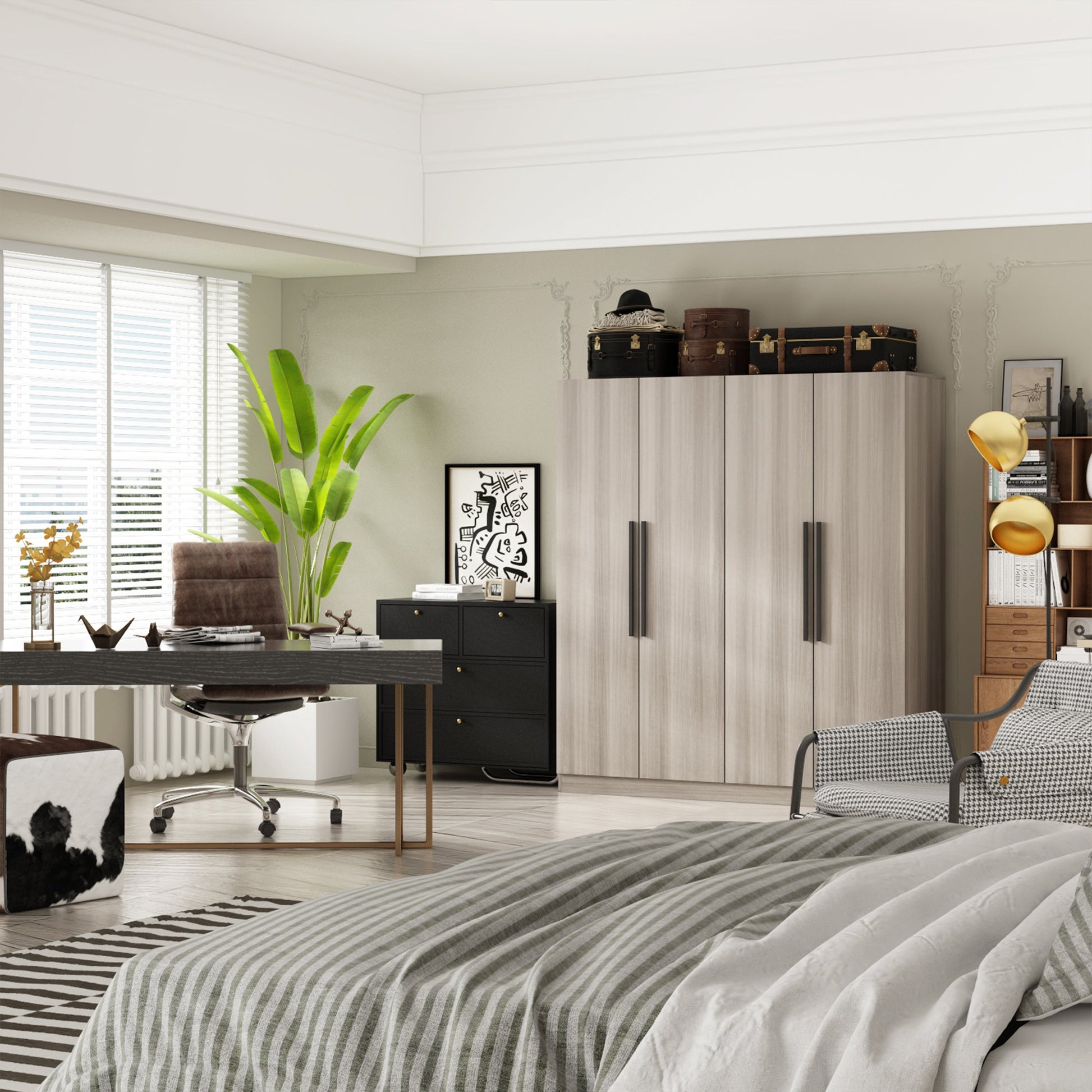 Cette armoire-penderie blanche en bois, avec ses étagères, ses tiroirs, ses penderies et ses 4 portes, répond parfaitement à vos besoins de rangement et de décoration ! Vous l'adorerez dans votre chambre.