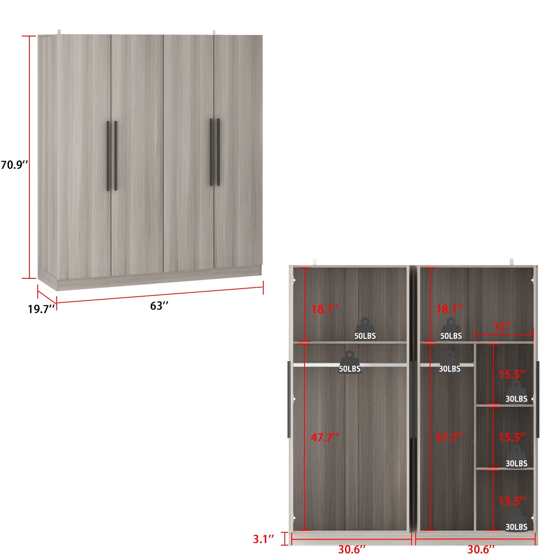 Armoire de rangement en bois manufacturé, grande penderie familiale avec barres de suspension