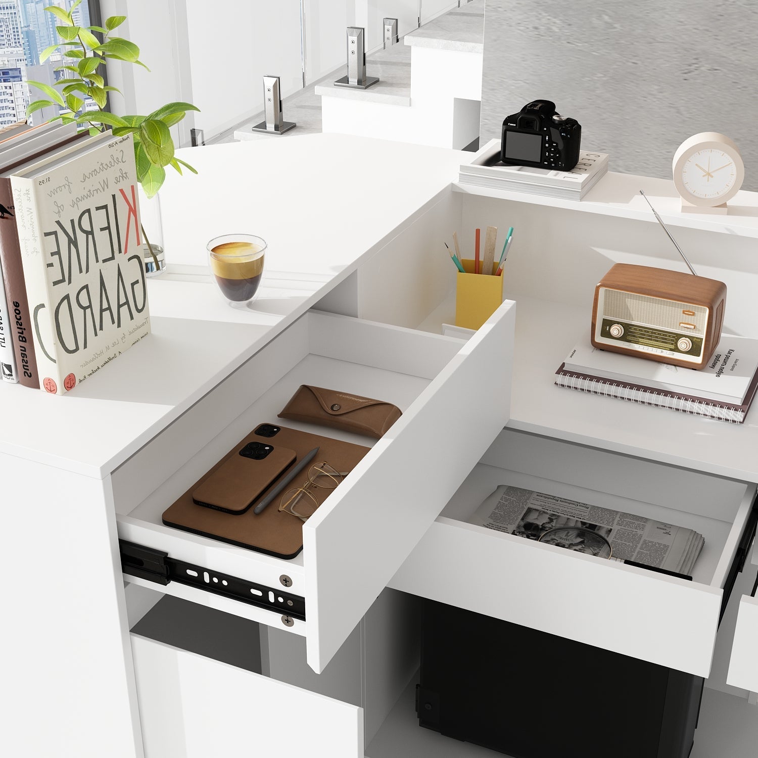 Ce comptoir d'accueil moderne est conçu pour créer un espace de travail accueillant et organisé, idéal pour un hall d'accueil, un bureau ou une salle d'attente. Son design élégant, avec des étagères ouvertes côté visiteurs, offre un espace généreux pour exposer objets décoratifs, brochures et autres fournitures. Côté réceptionniste, des solutions de rangement fonctionnelles avec tiroirs et placards permettent de ranger les objets avec soin et de les garder à portée de main. Avec ses lignes épurées, sa finition blanche et ses détails bien pensés, ce comptoir allie style et fonctionnalité, ce qui en fait un choix parfait pour les environnements professionnels.
