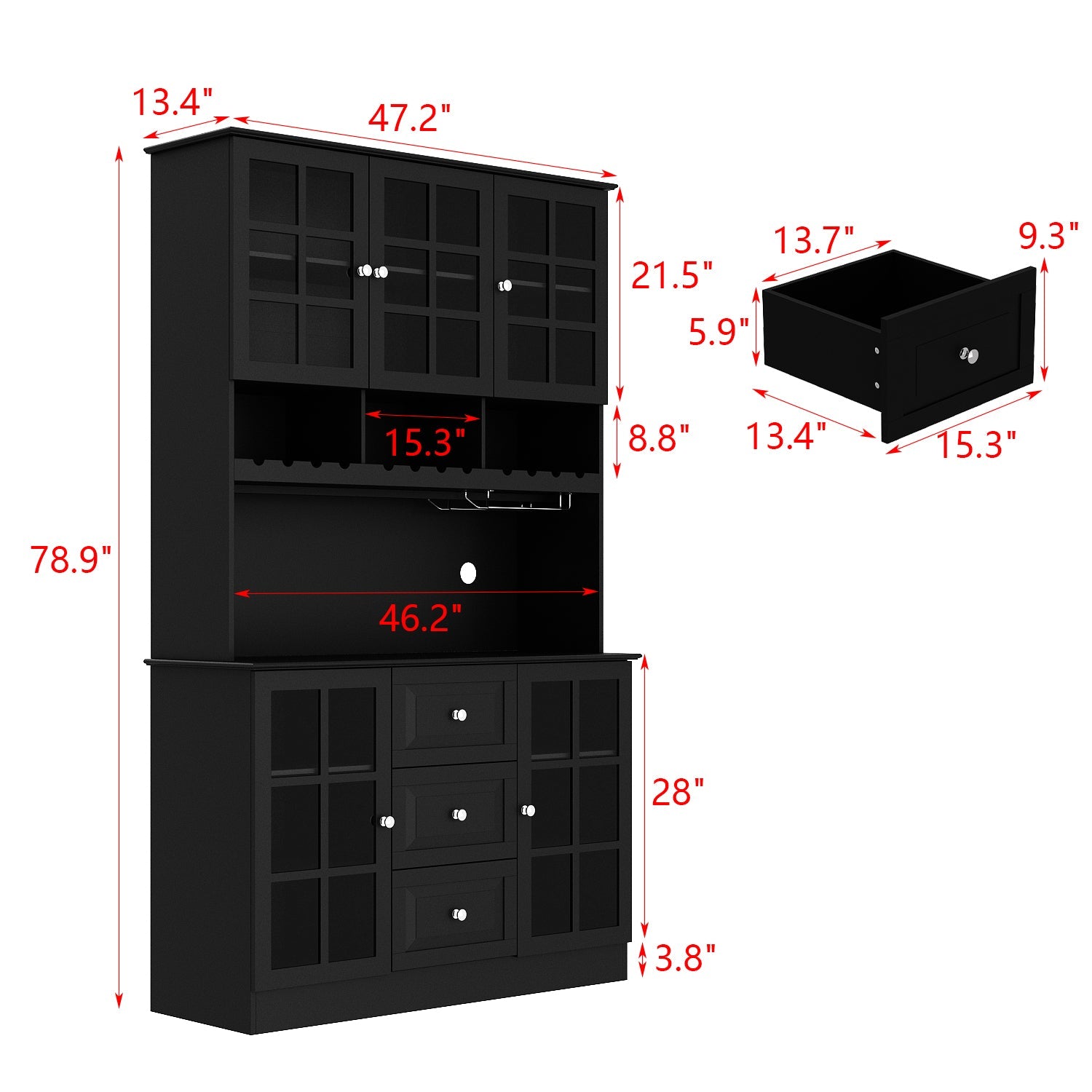 Buffet bar avec porte vitrée, vaisselier de cuisine avec tiroirs, porte-verres et casier à vin