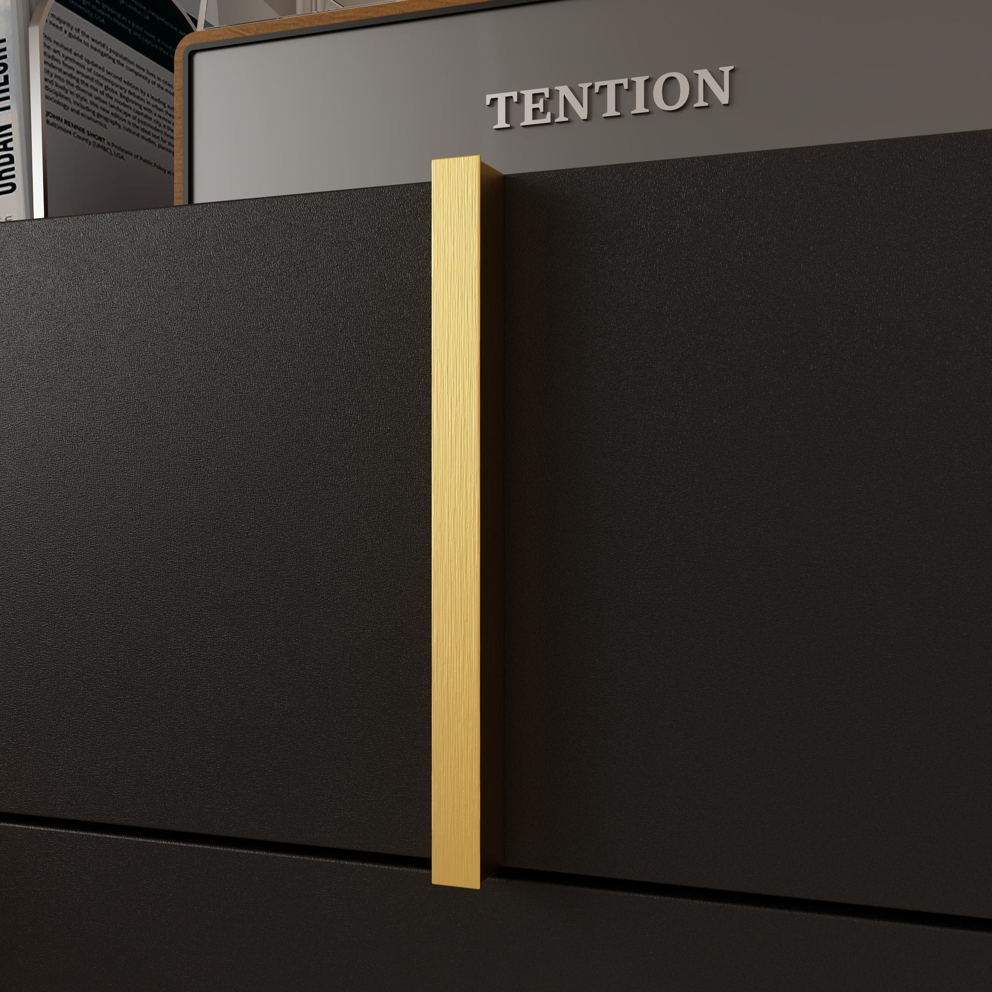 Cette élégante commode à huit tiroirs allie fonctionnalité et modernité. Sa finition noire est rehaussée de détails dorés du plus bel effet. Ses tiroirs spacieux offrent un grand espace de rangement pour les vêtements, le linge de maison et les effets personnels, ce qui en fait un meuble idéal pour toute chambre. Sa construction robuste lui assure une grande stabilité, tandis que son design épuré contribue à l'esthétique de la pièce. Avec ses lignes nettes et son allure affirmée, cette commode s'intègre harmonieusement aux styles de décoration contemporains, apportant une touche de sophistication à votre intérieur.