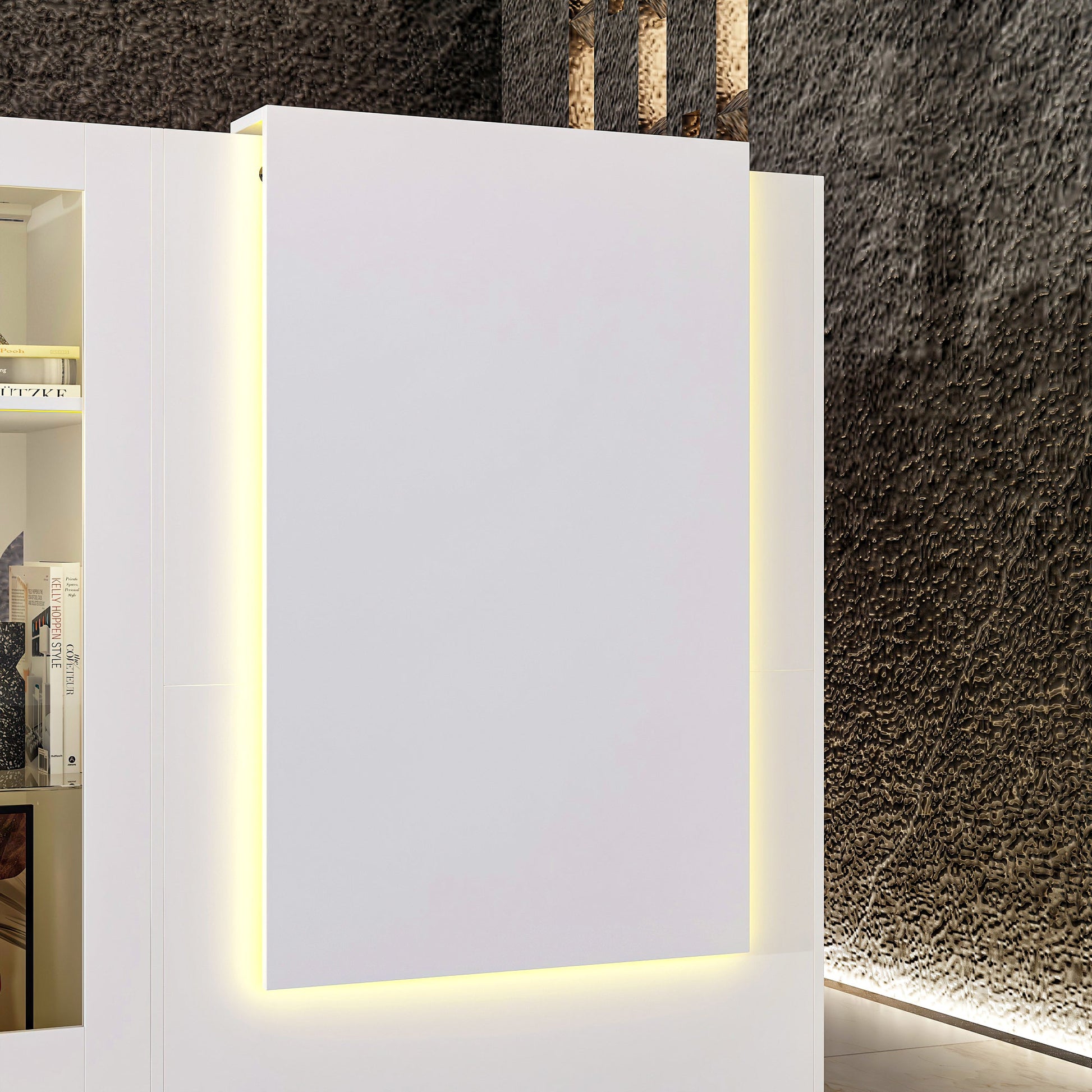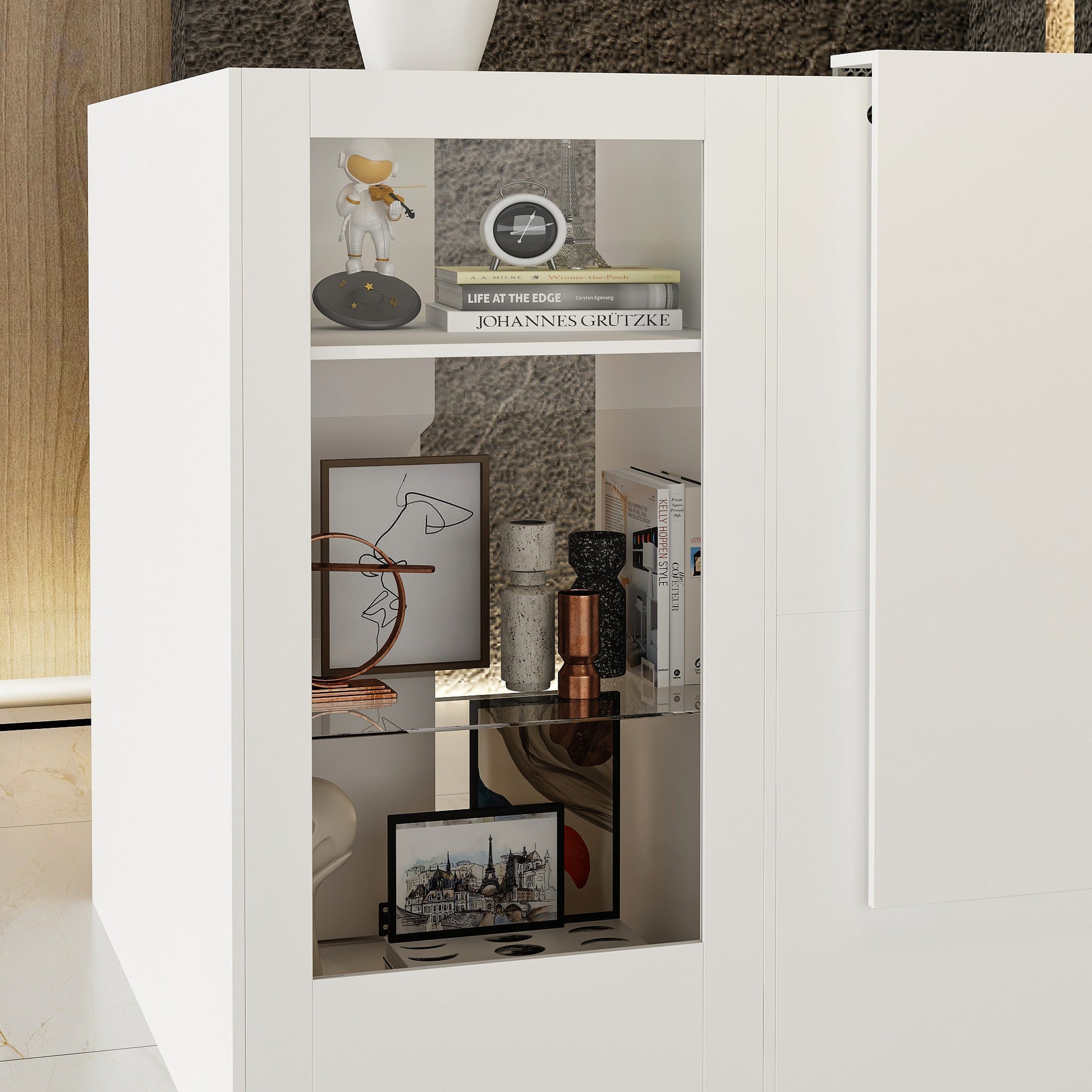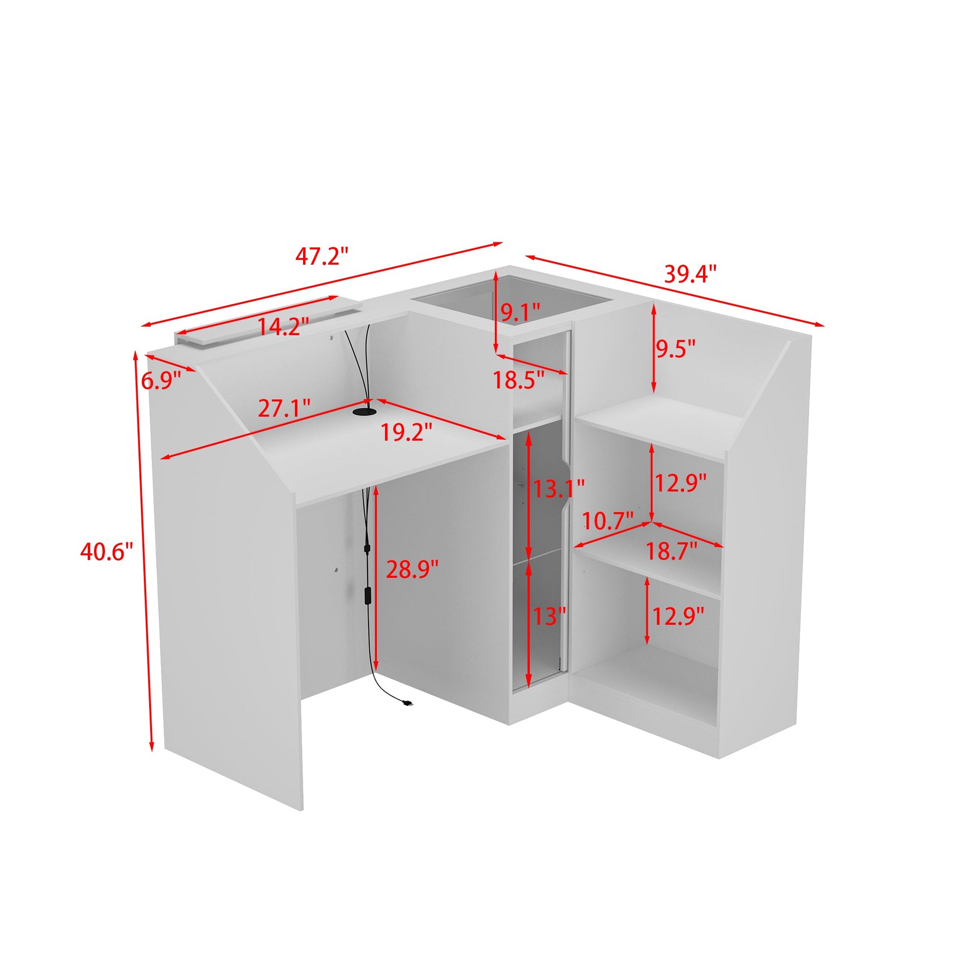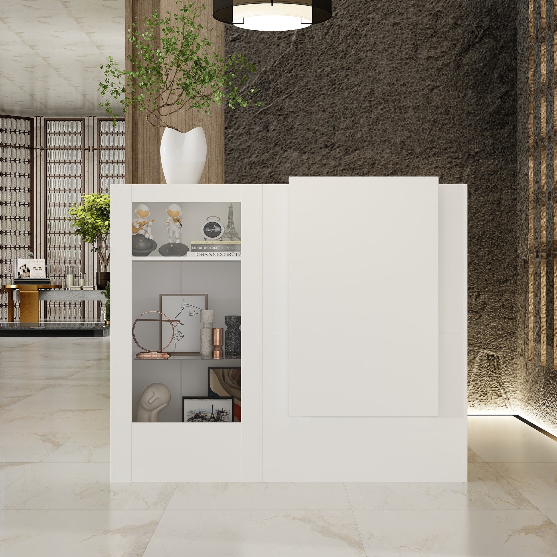 Comptoir d'accueil moderne à éclairage LED avec étagères ouvertes et compartiments de rangement