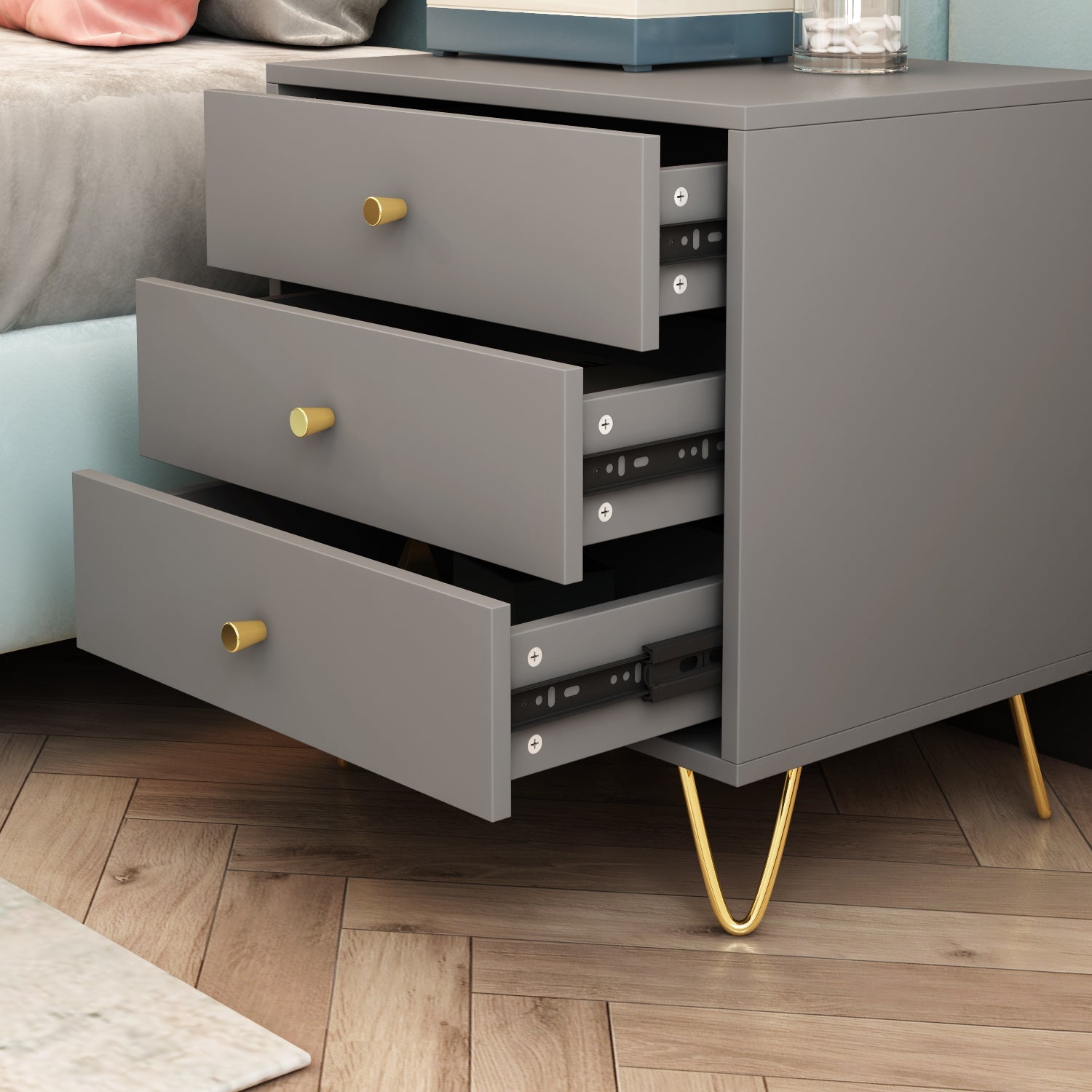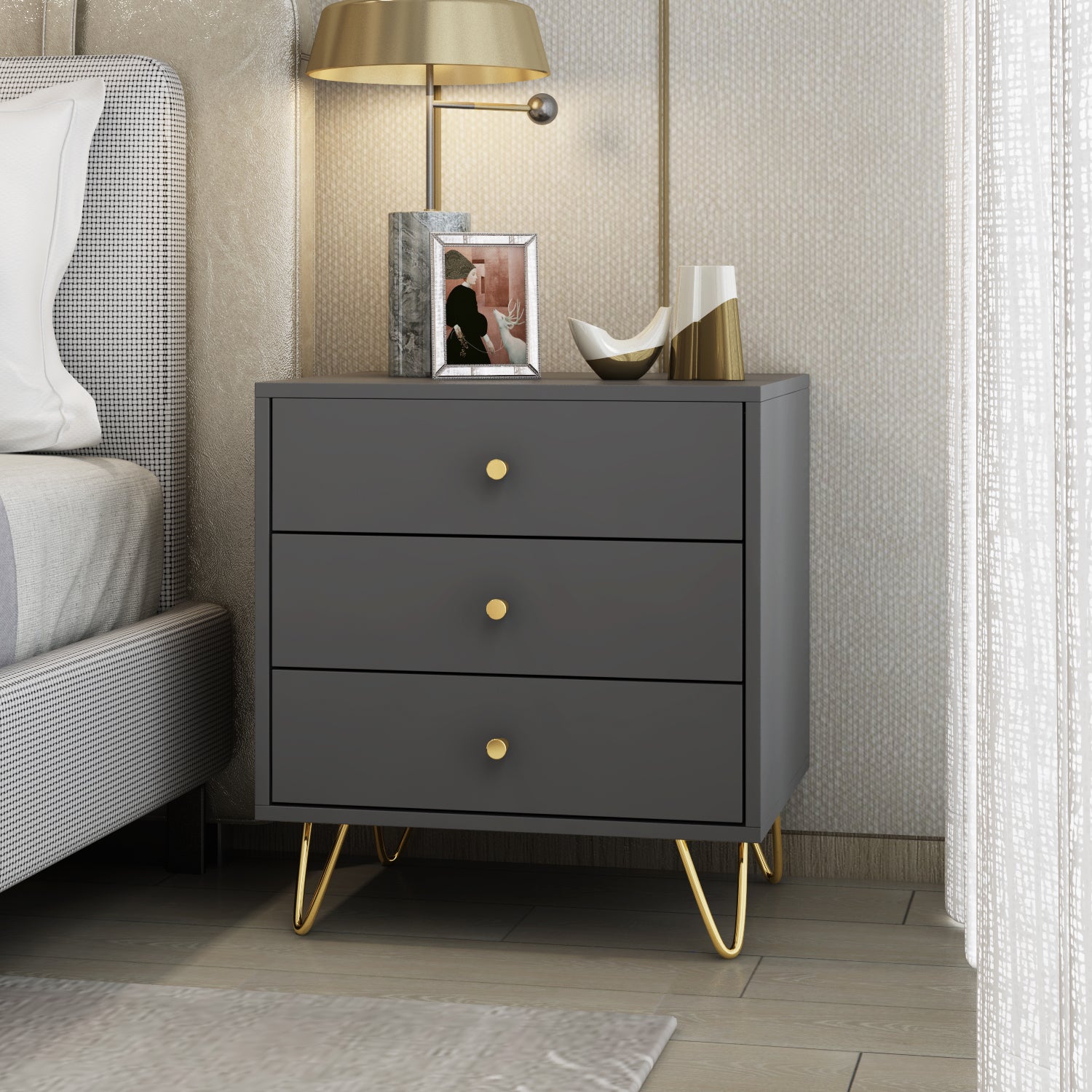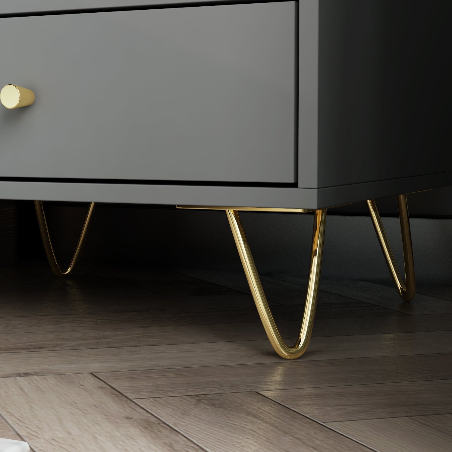Table de chevet blanche et grise aux poignées fines en métal et aux pieds en fil d'or. Son style minimaliste et moderne transforme votre chambre en un espace luxueux.