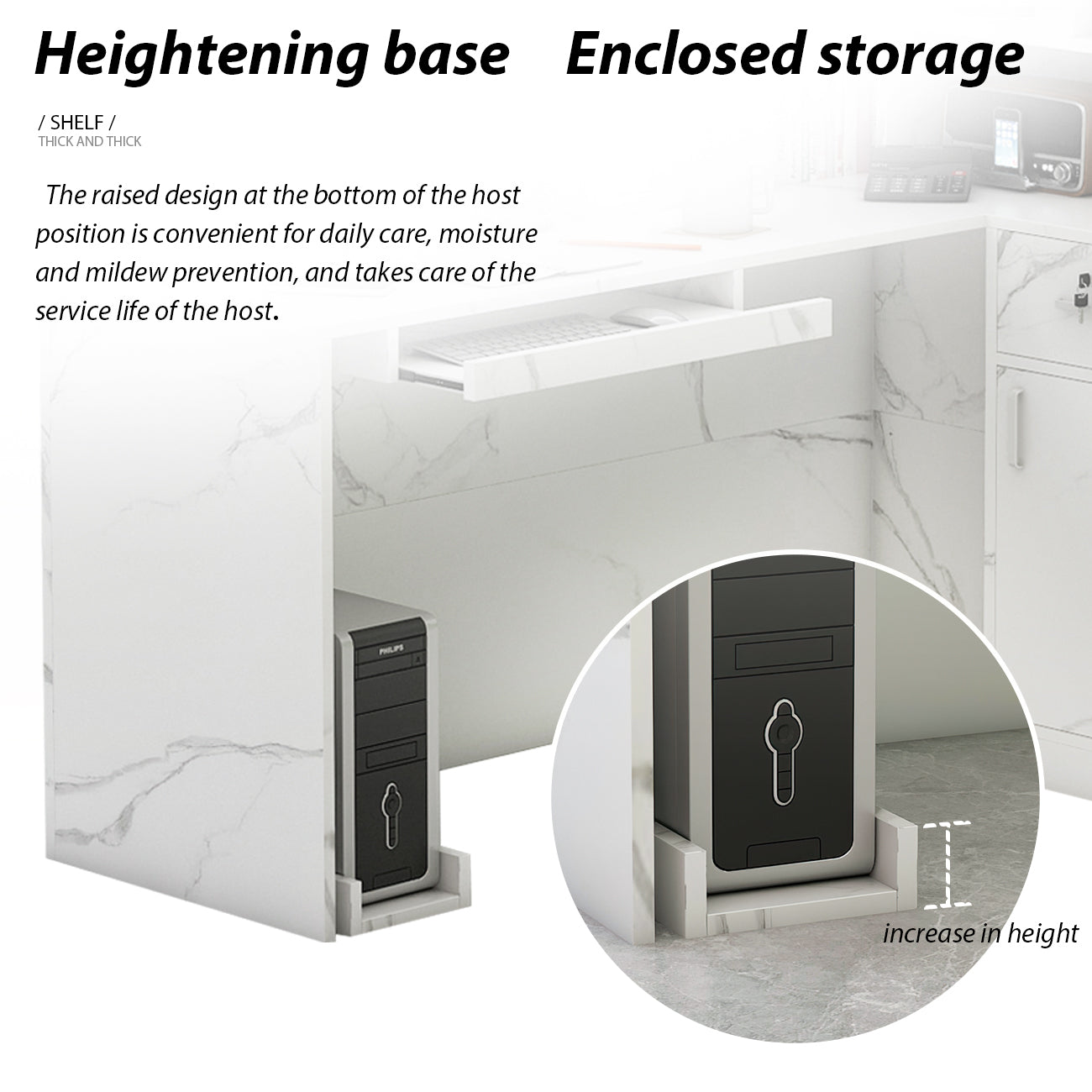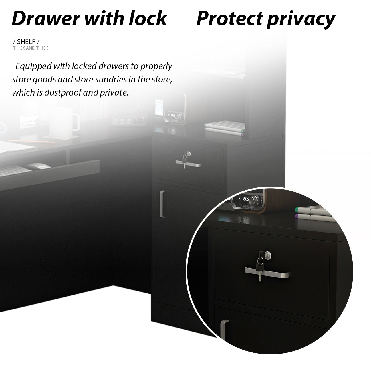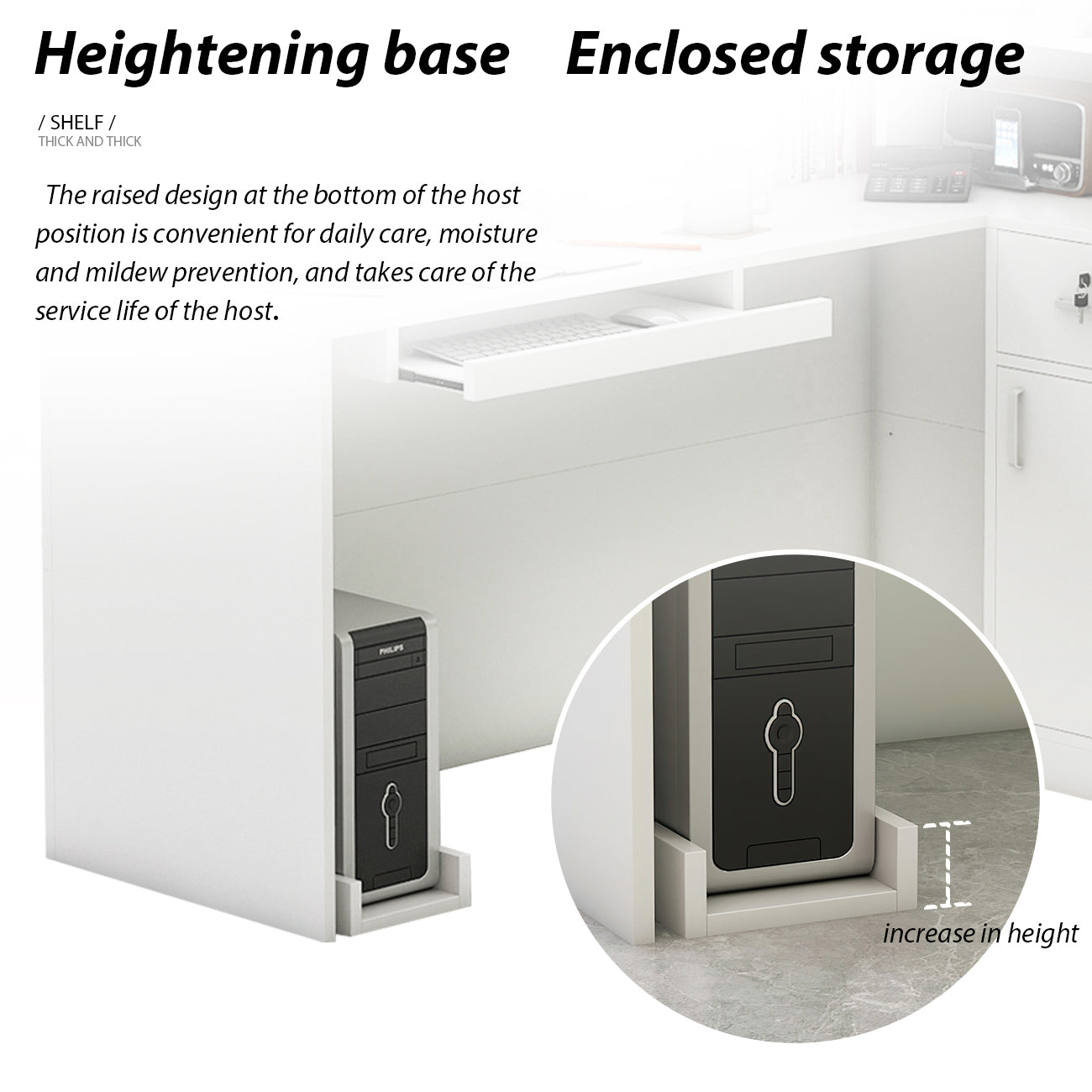 Bureau d'accueil en forme de L avec grands classeurs de rangement